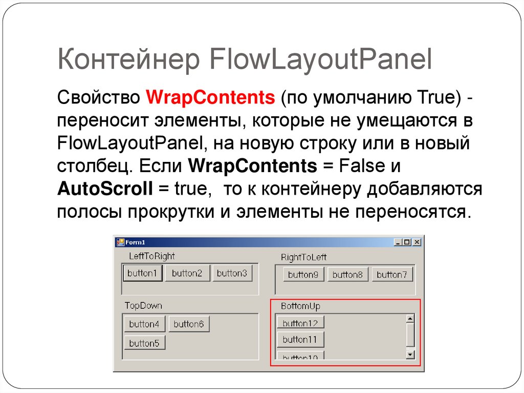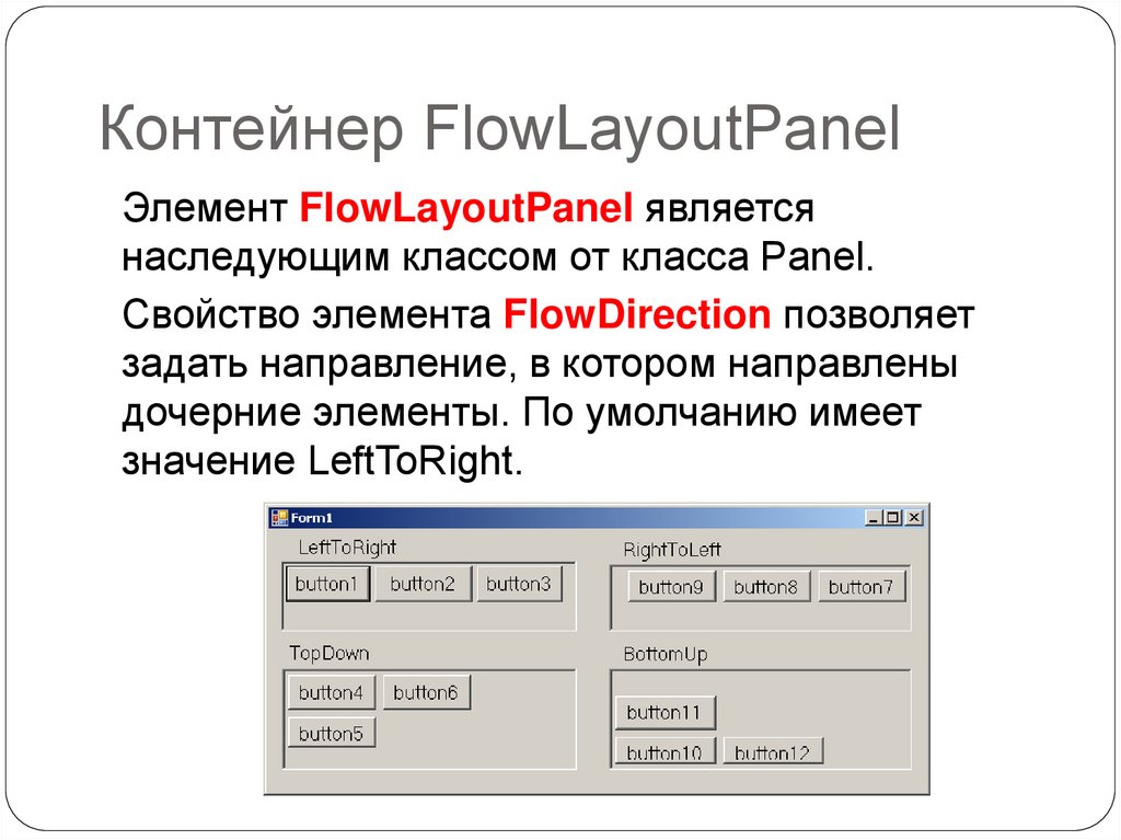 Контейнер FlowLayoutPanelЭлемент FlowLayoutPanel является