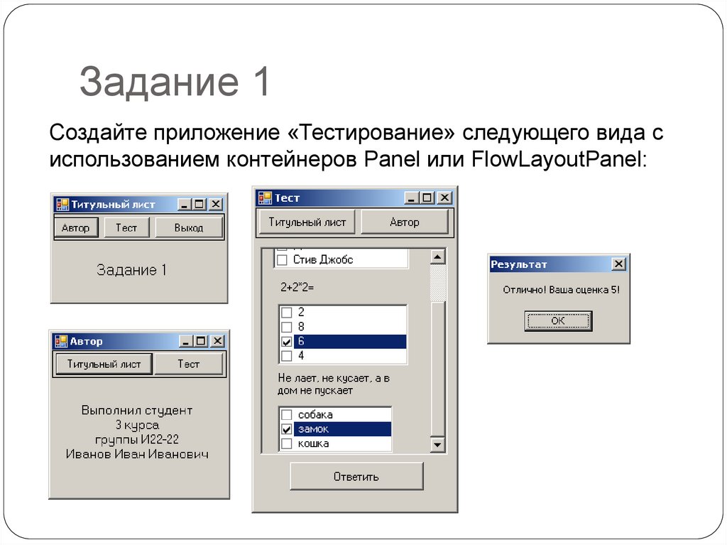 Задание 1Создайте приложение «Тестирование» следующего вида с