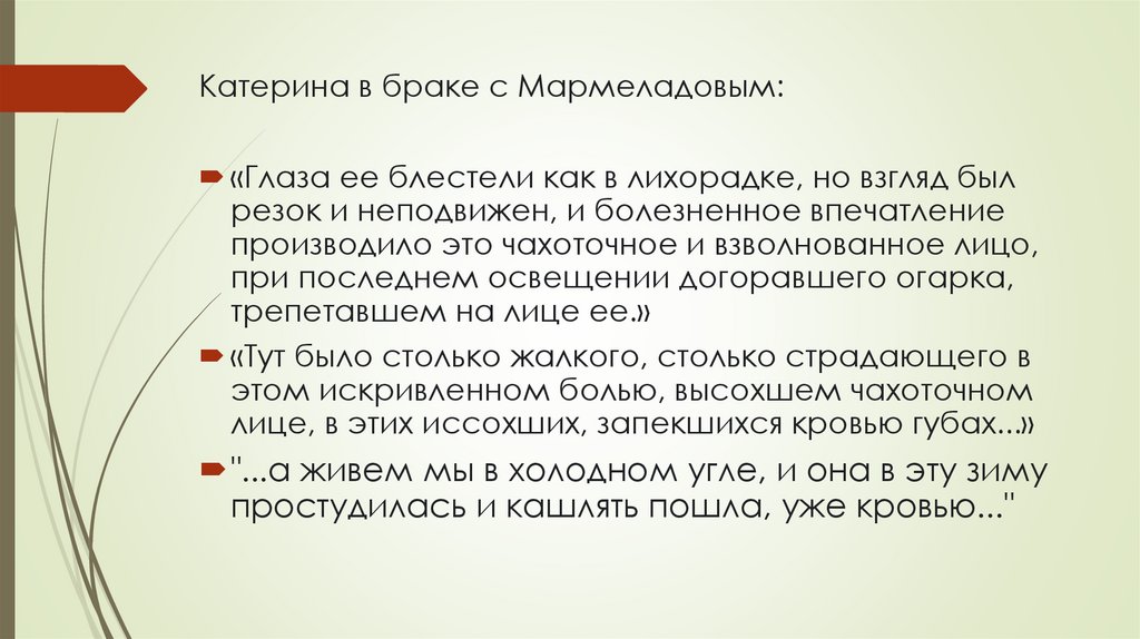 Катерина в браке с Мармеладовым:«Глаза ее блестели как в лихорадке, но взгляд был