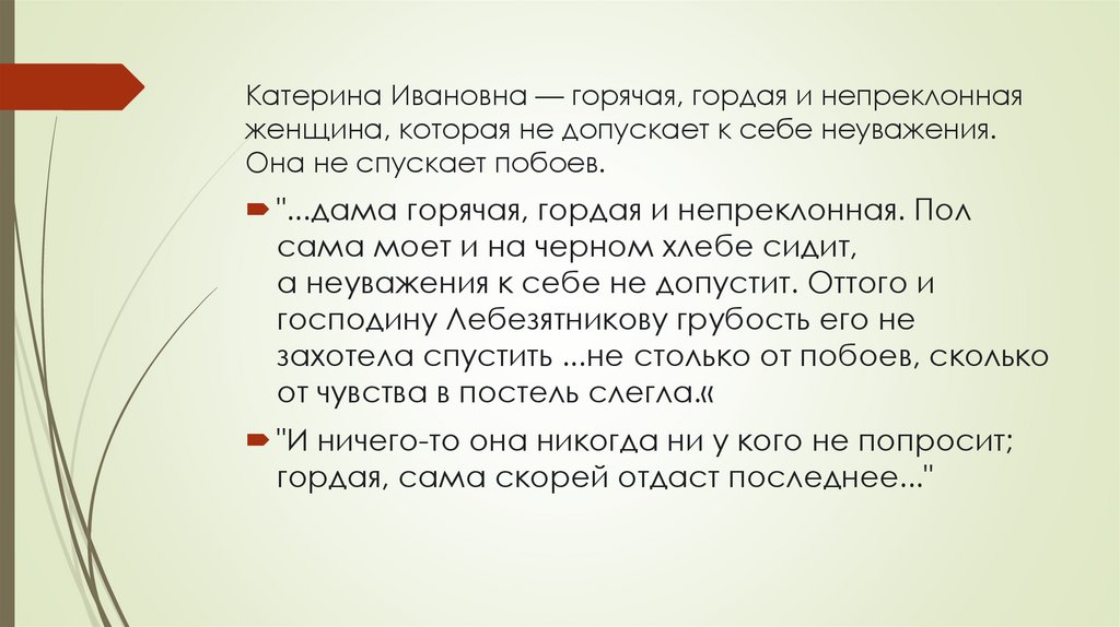 Катерина Ивановна — горячая, гордая и непреклоннаяженщина, которая не допускает к себе неуважения.