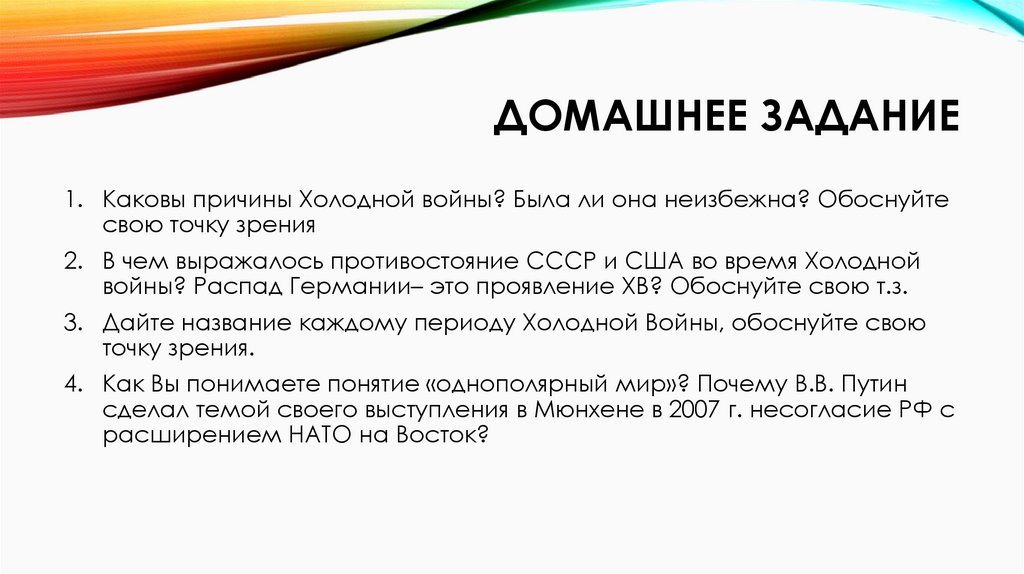 1. Каковы причины Холодной войны? Была ли она неизбежна? Обоснуйтесвою точку зрения
