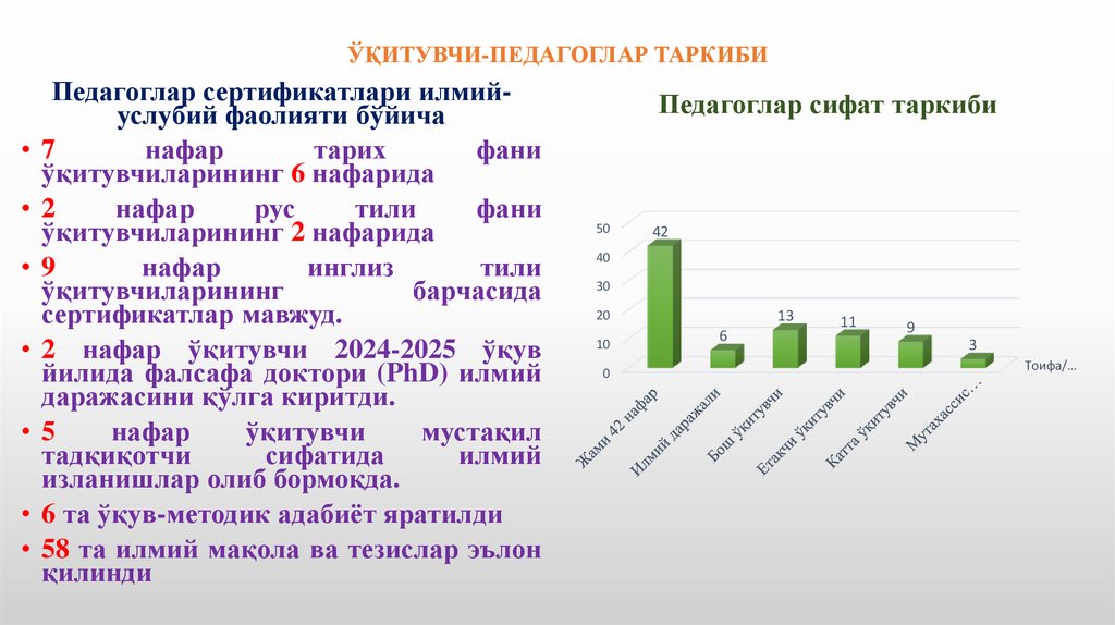 ЎҚИТУВЧИ-ПЕДАГОГЛАР ТАРКИБИПедагоглар сертификатлари илмийуслубий фаолияти бўйича