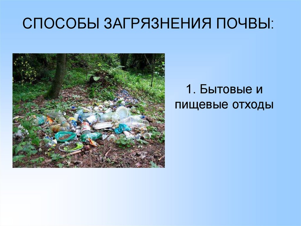 СПОСОБЫ ЗАГРЯЗНЕНИЯ ПОЧВЫ:1. Бытовые и