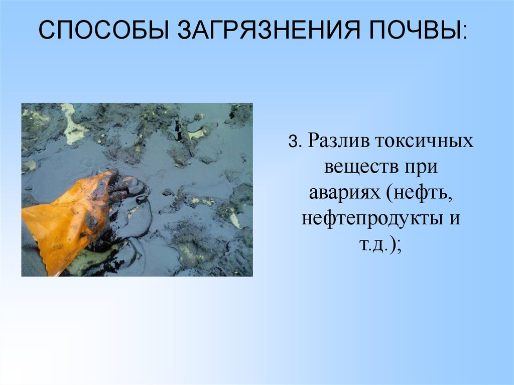 СПОСОБЫ ЗАГРЯЗНЕНИЯ ПОЧВЫ:3. Разлив токсичных