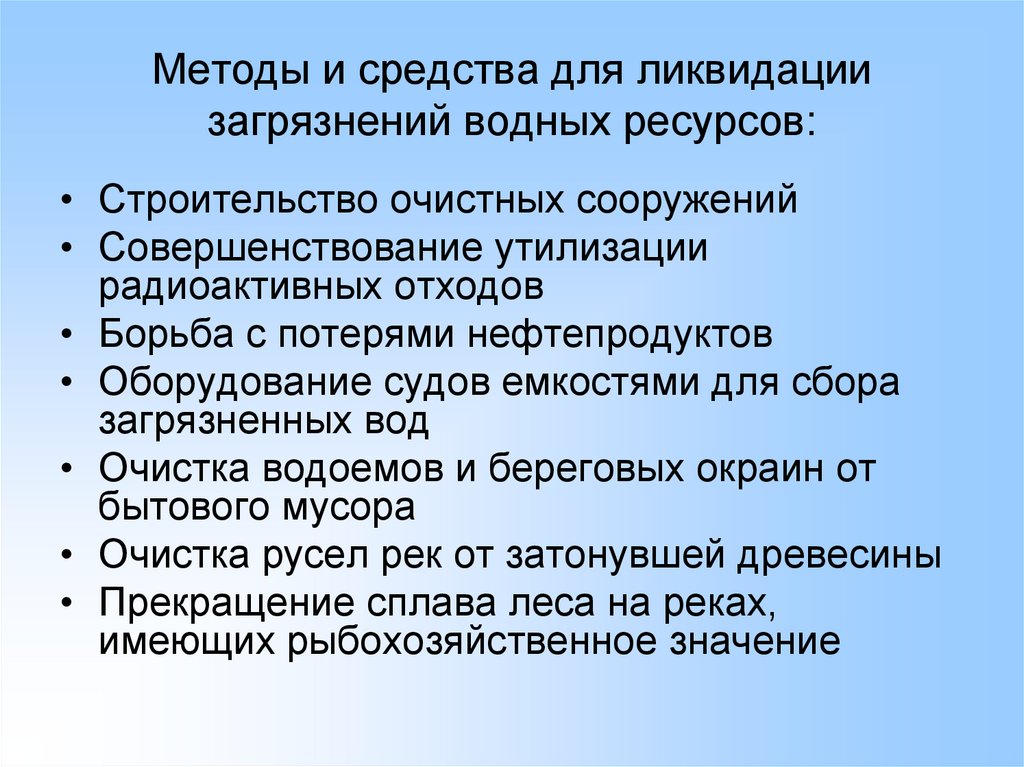 Методы и средства для ликвидациизагрязнений водных ресурсов: