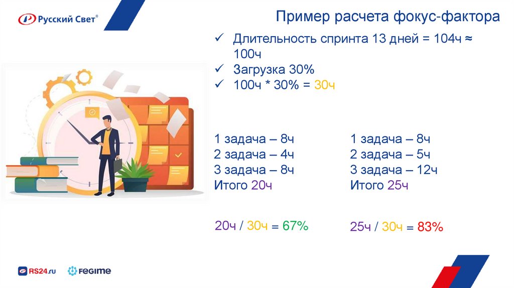 Пример расчета фокус-фактораДлительность спринта 13 дней = 104ч ≈