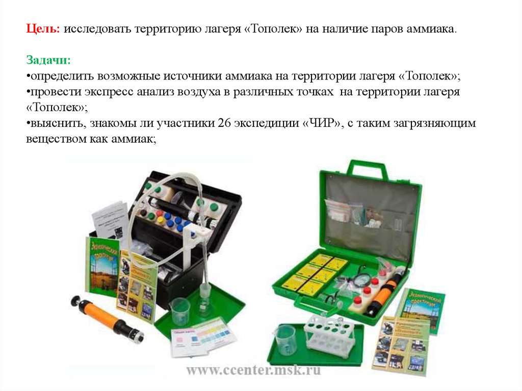 Цель: исследовать территорию лагеря «Тополек» на наличие паров аммиака.Задачи: