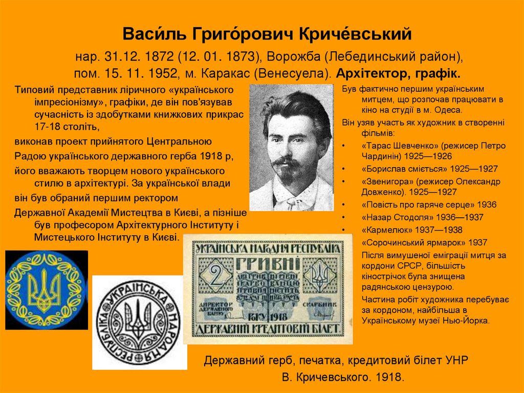 6. Васи́ль Григо́рович Криче́вський нар. 31.12. 1872 (12. 01. 1873), Ворожба (Лебединський район), пом. 15. 11. 1952, м. Каракас