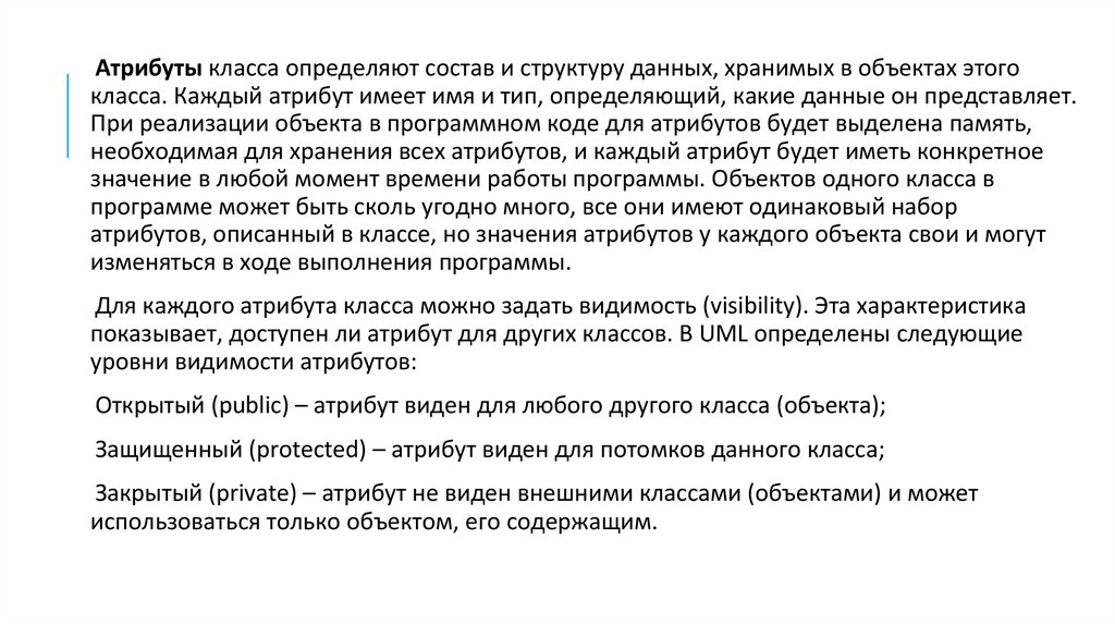 Атрибуты класса определяют состав и структуру данных, хранимых в объектах этогокласса. Каждый атрибут имеет имя и тип, определяющий, какие данные он представляет.