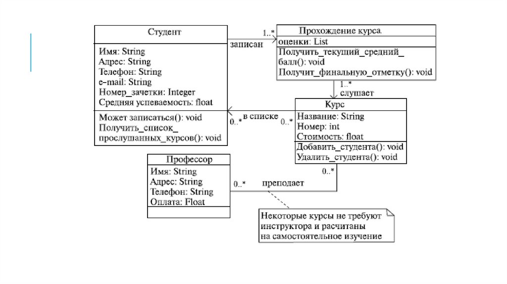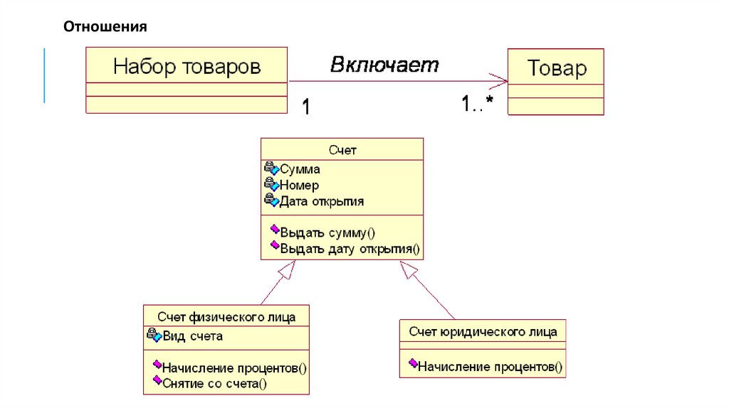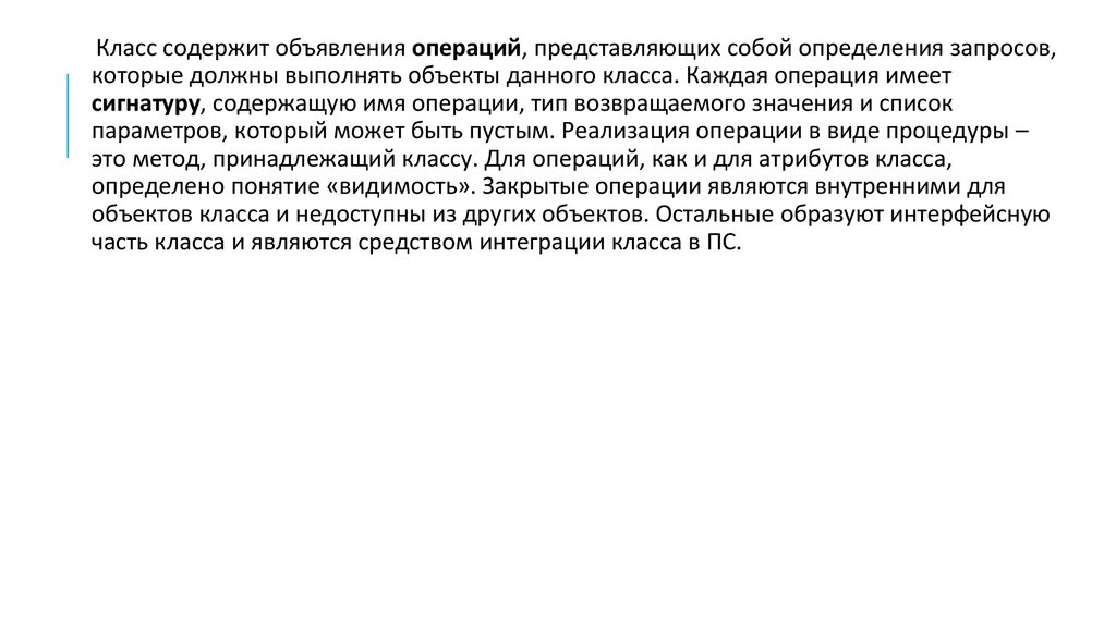Класс содержит объявления операций, представляющих собой определения запросов,которые должны выполнять объекты данного класса. Каждая операция имеет