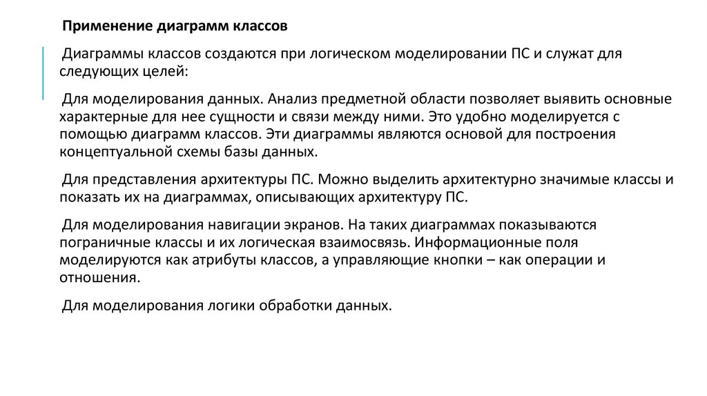 Применение диаграмм классовДиаграммы классов создаются при логическом моделировании ПС и служат для