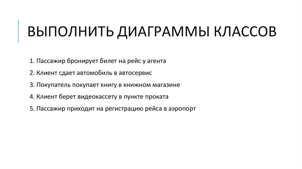 ВЫПОЛНИТЬ ДИАГРАММЫ КЛАССОВ1. Пассажир бронирует билет на рейс у агента