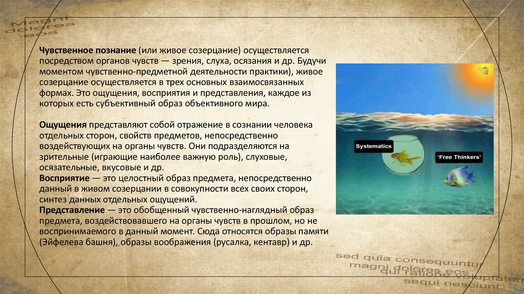 Чувственное познание (или живое созерцание) осуществляетсяпосредством органов чувств — зрения, слуха, осязания и др. Будучи