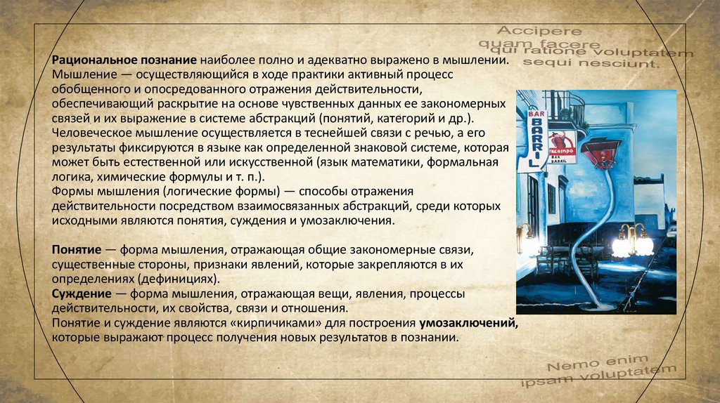 Рациональное познание наиболее полно и адекватно выражено в мышлении.Мышление — осуществляющийся в ходе практики активный процесс