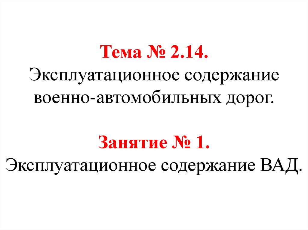 1. Тема № 2.14. Эксплуатационное содержание военно-автомобильных дорог. Занятие № 1. Эксплуатационное содержание ВАД.
