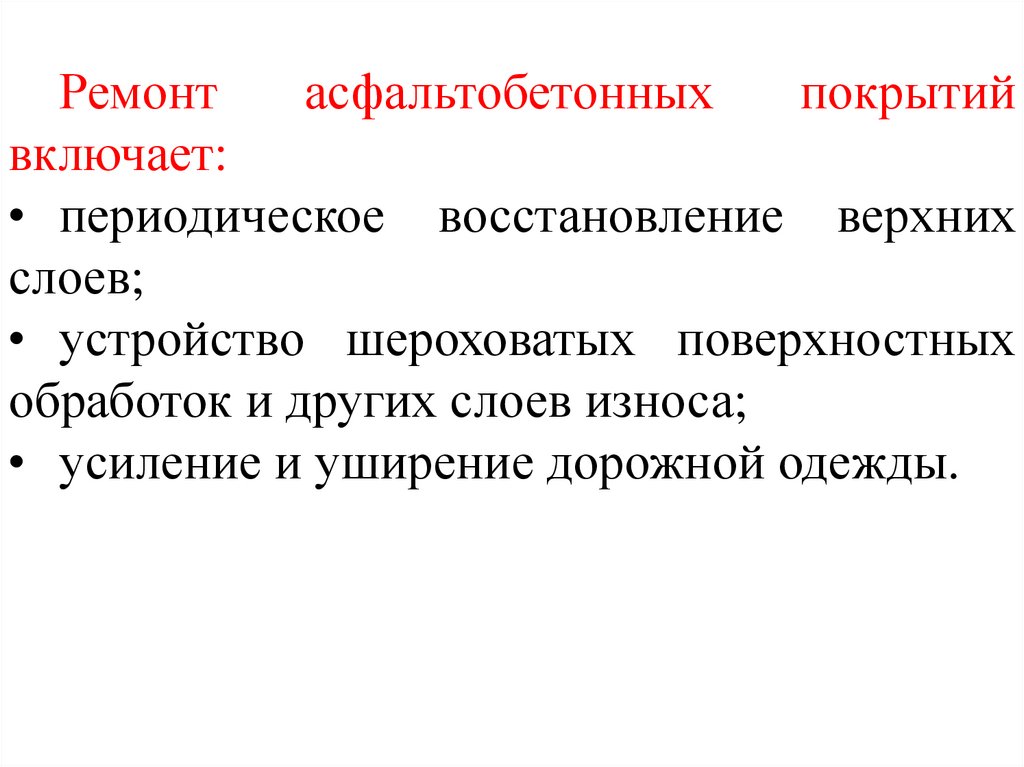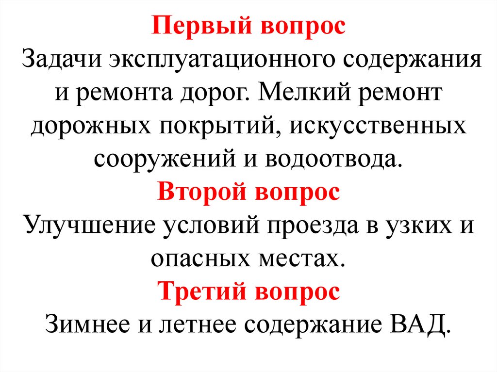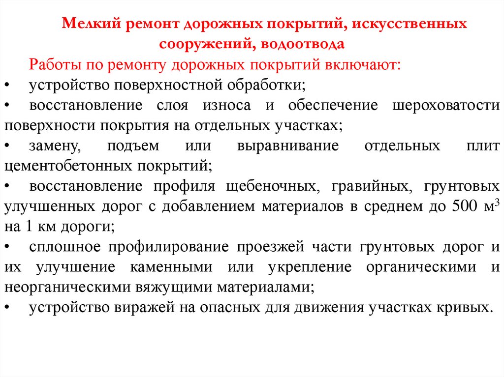 3. Первый вопрос Задачи эксплуатационного содержания и ремонта дорог. Мелкий ремонт дорожных покрытий, искусственных сооружений и