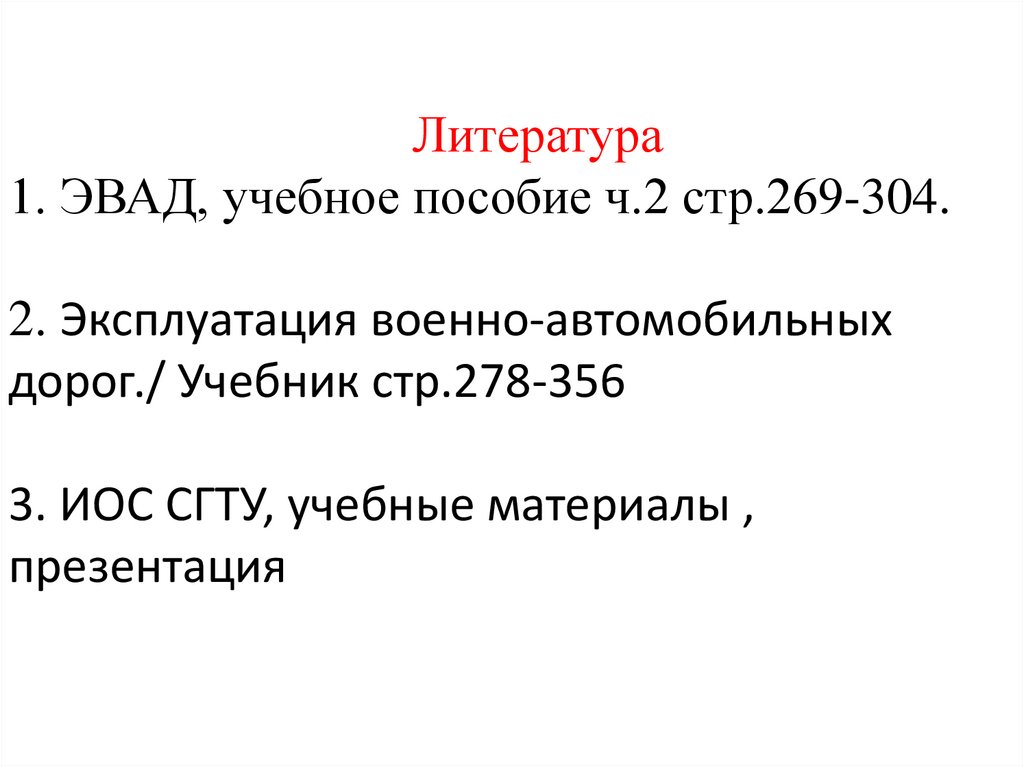 4. Литература 1. ЭВАД, учебное пособие ч.2 стр.269-304. 2. Эксплуатация военно-автомобильных дорог./ Учебник стр.278-356 3. ИОС