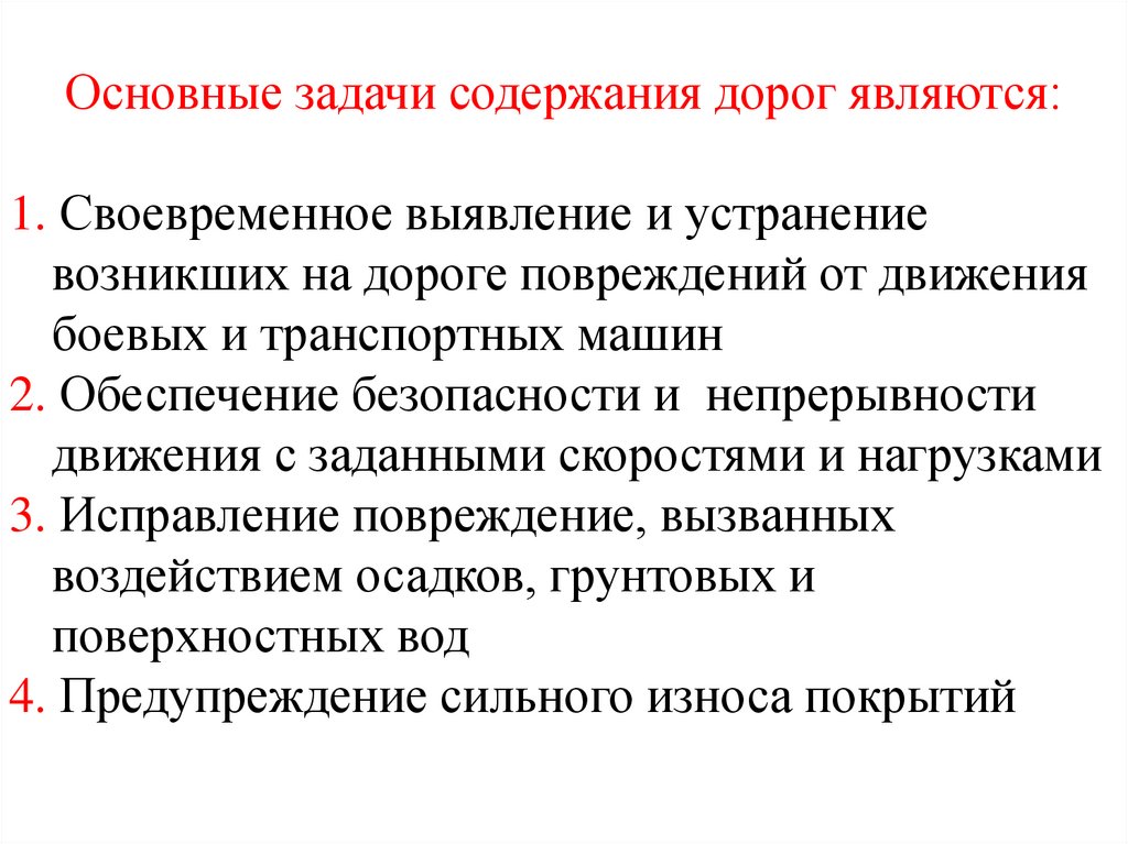 Основные задачи содержания дорог являются:1. Своевременное выявление и устранение