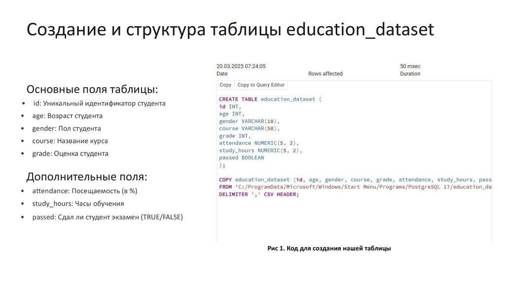 Создание и структура таблицы education_datasetОсновные поля таблицы: