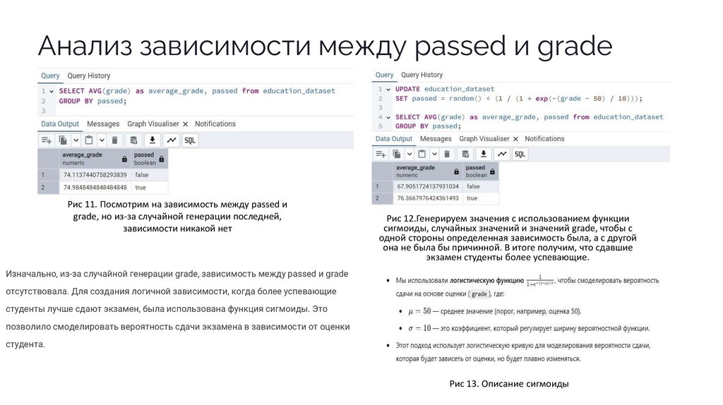Изначально, из-за случайной генерации grade, зависимость между passed и grade
