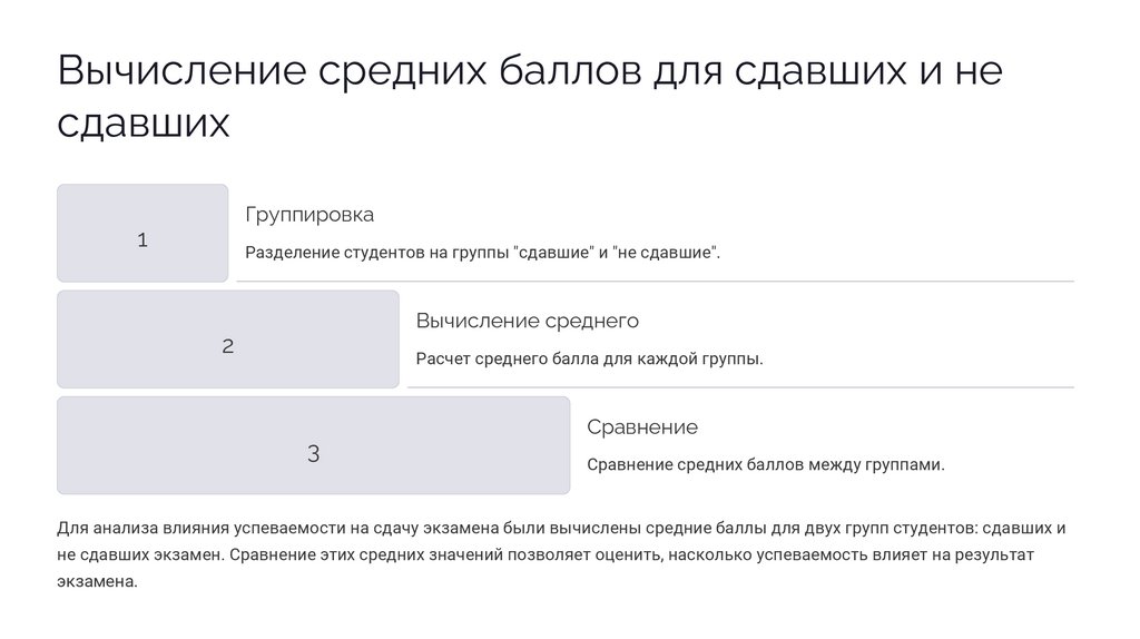 Для анализа влияния успеваемости на сдачу экзамена были вычислены средние баллы для двух групп студентов: сдавших и