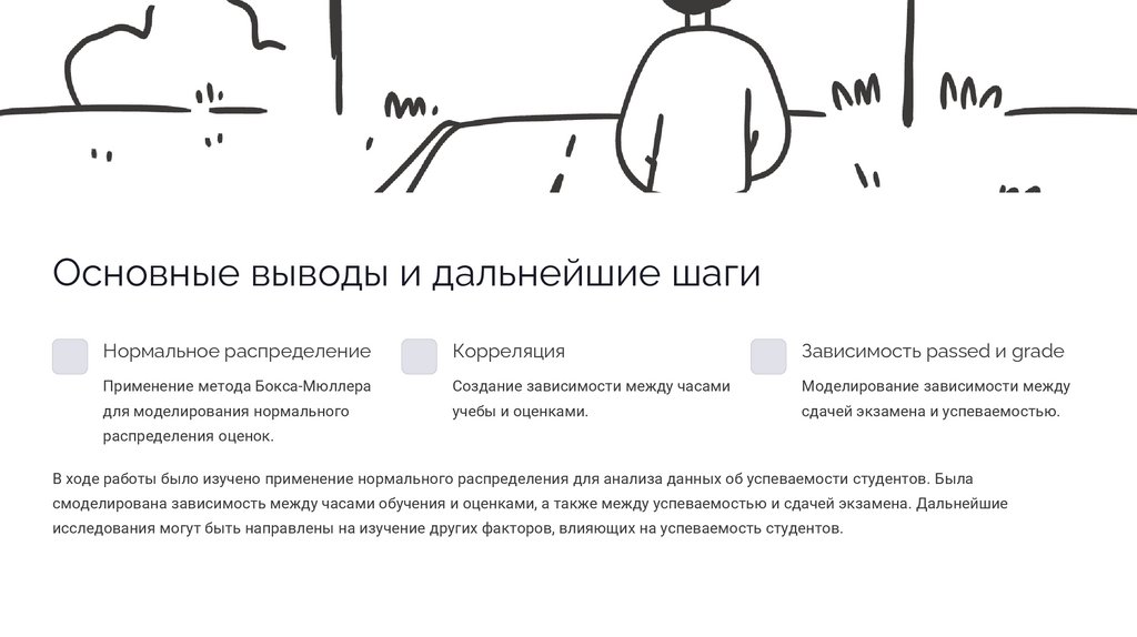 смоделирована зависимость между часами обучения и оценками, а также между успеваемостью и сдачей экзамена. Дальнейшие