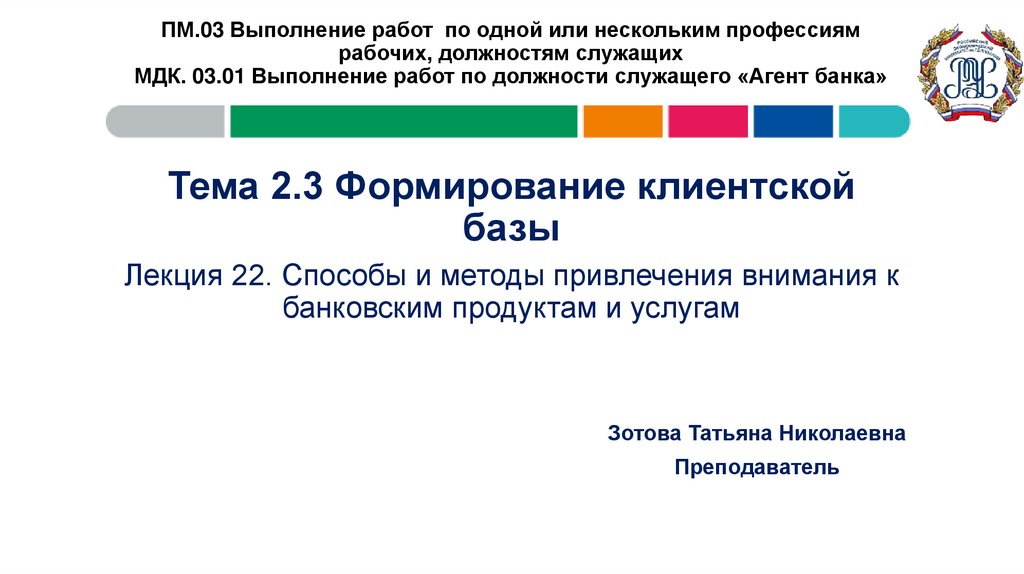 МДК. 03.01 Выполнение работ по должности служащего «Агент банка»
