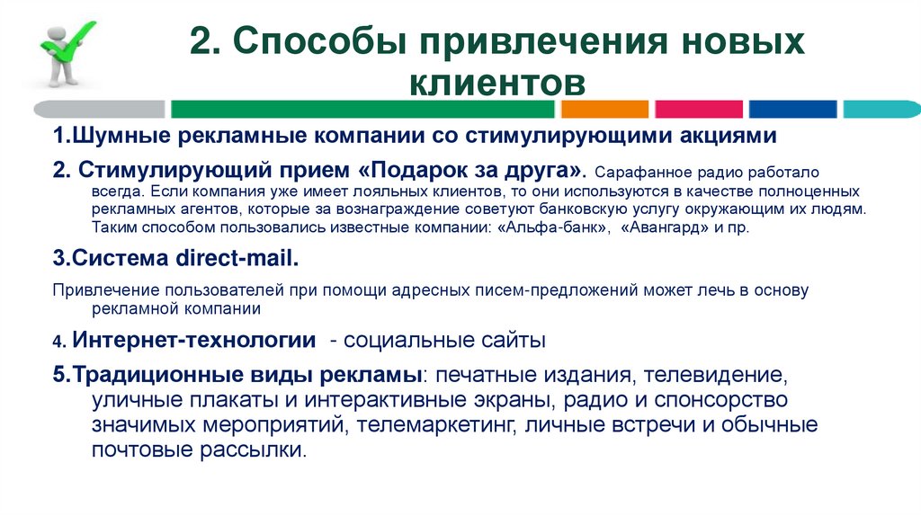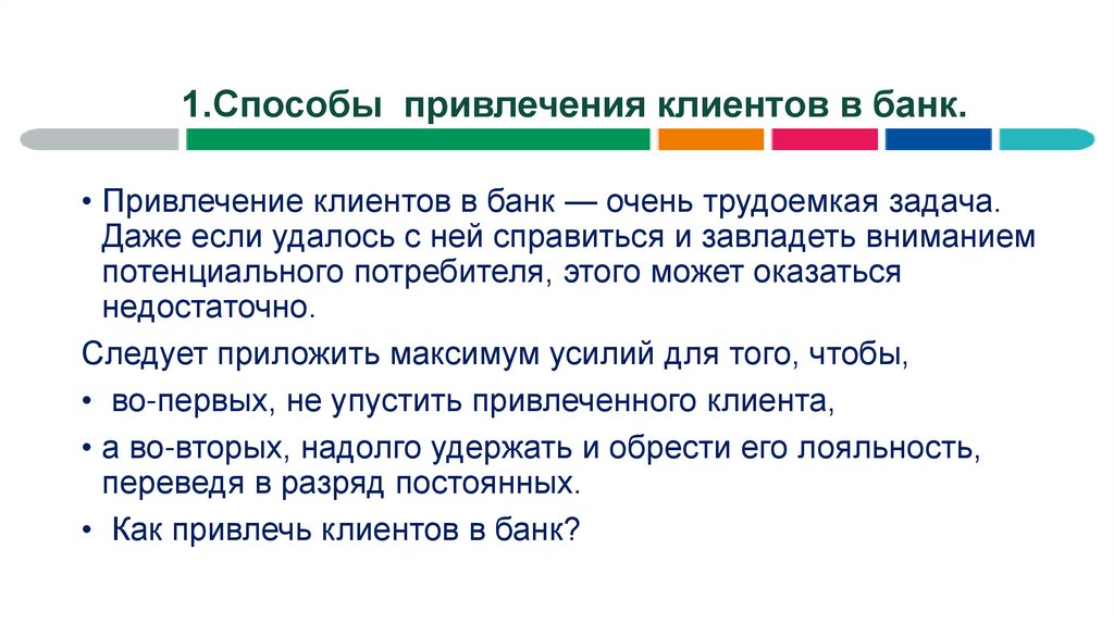 1.Способы привлечения клиентов в банк.• Привлечение клиентов в банк — очень трудоемкая задача.
