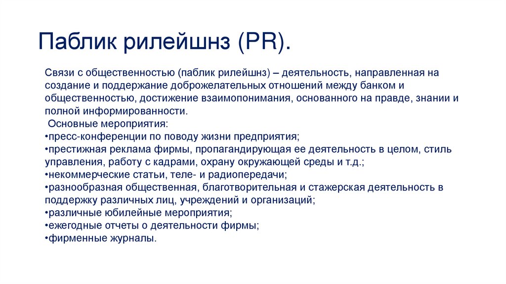 Паблик рилейшнз (PR).Связи с общественностью (паблик рилейшнз) – деятельность, направленная на