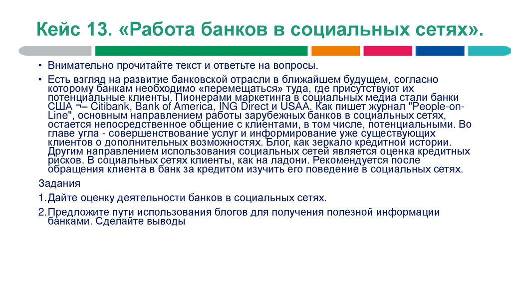 Кейс 13. «Работа банков в социальных сетях».• Внимательно прочитайте текст и ответьте на вопросы.
