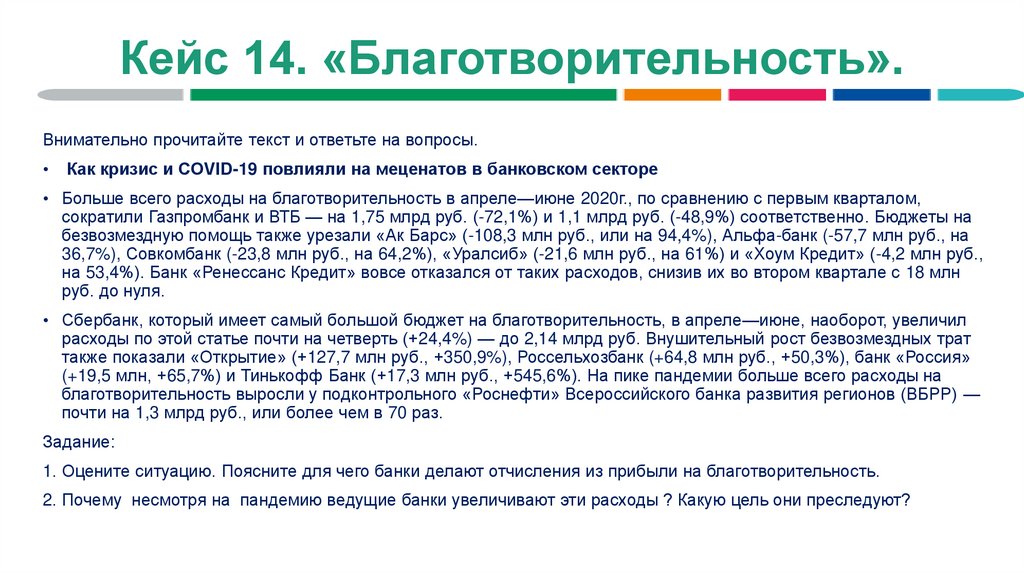 Кейс 14. «Благотворительность».Внимательно прочитайте текст и ответьте на вопросы.