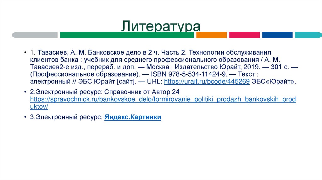 Литература• 1. Тавасиев, А. М. Банковское дело в 2 ч. Часть 2. Технологии обслуживания