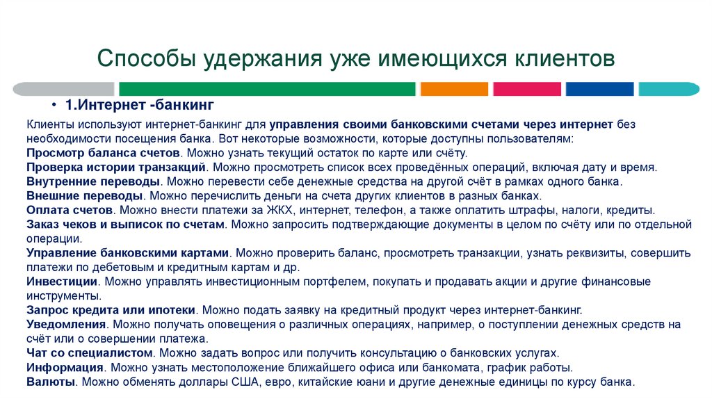 Способы удержания уже имеющихся клиентов• 1.Интернет -банкинг