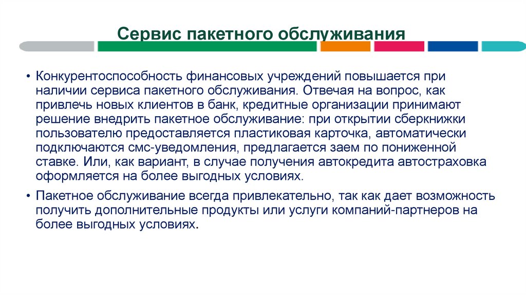 Сервис пакетного обслуживания• Конкурентоспособность финансовых учреждений повышается при