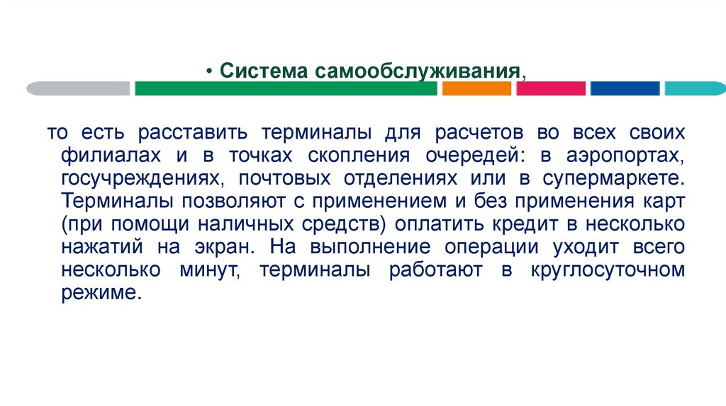 • Система самообслуживания,то есть расставить терминалы для расчетов во всех своих
