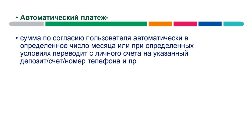 • Автоматический платеж• сумма по согласию пользователя автоматически вопределенное число месяца или при определенных
