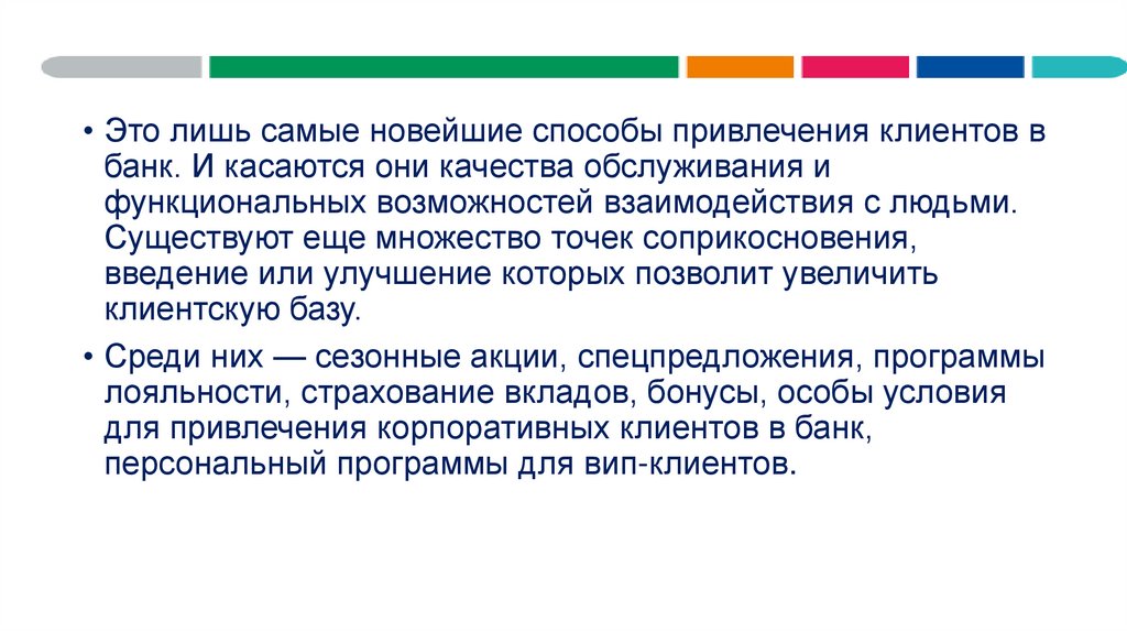 • Это лишь самые новейшие способы привлечения клиентов вбанк. И касаются они качества обслуживания и