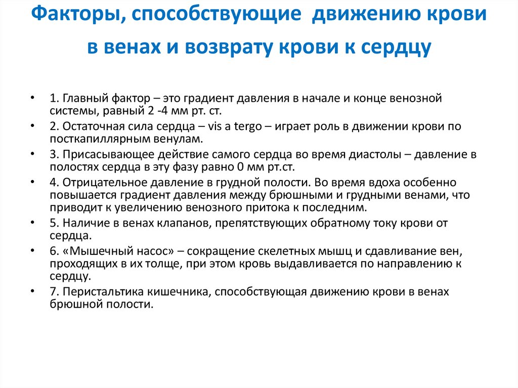 Факторы, способствующие движению кровив венах и возврату крови к сердцу