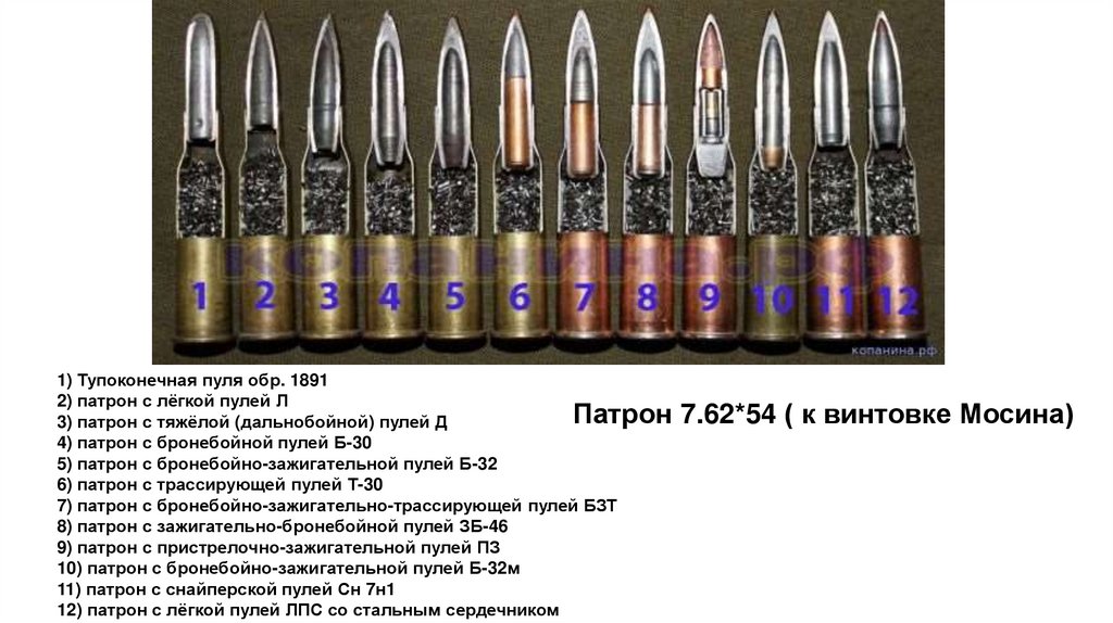 1) Тупоконечная пуля обр. 18912) патрон с лёгкой пулей Л
