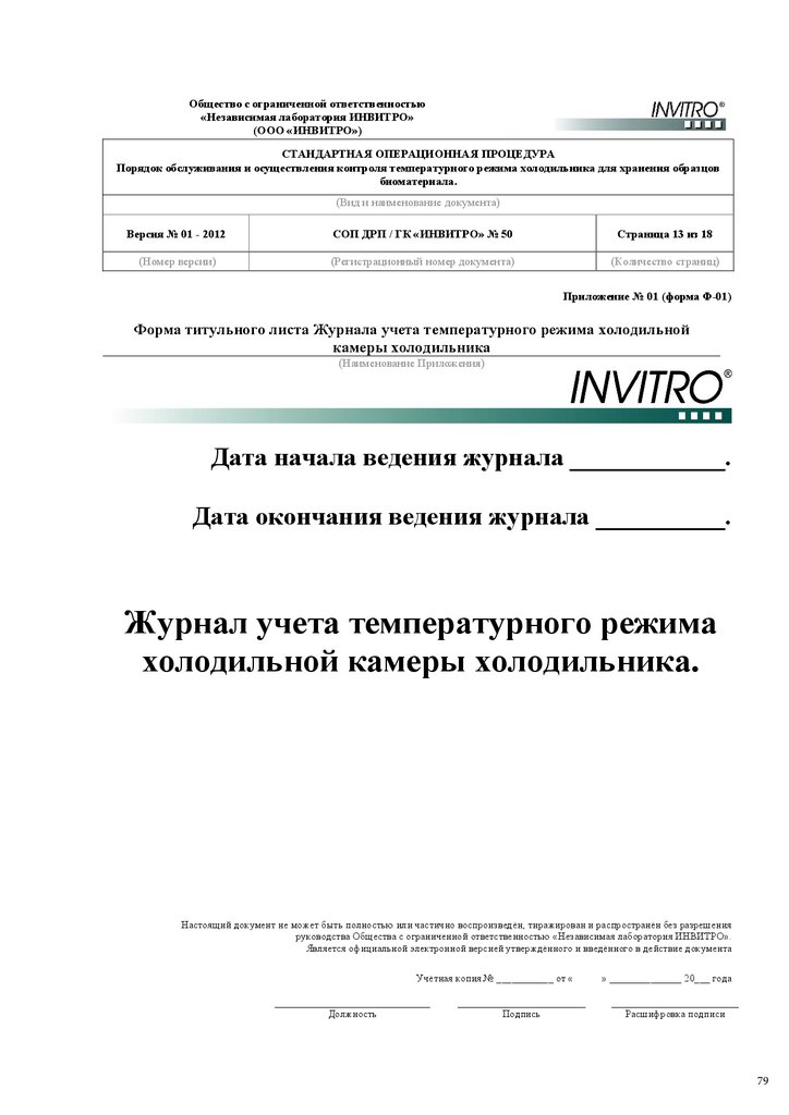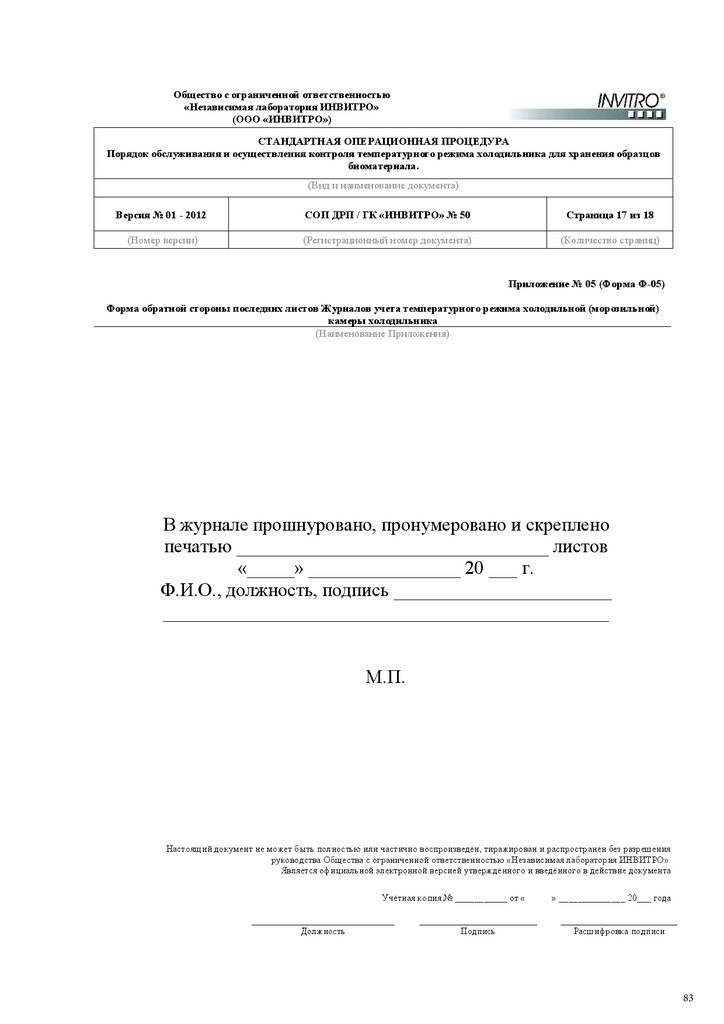 Форма обратной стороны последних листов Журналов учета температурного режима холодильной (морозильной)