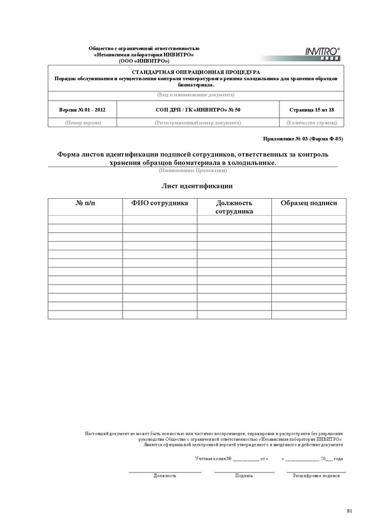 Приложение № 03 (Форма Ф-03). Форма листов идентификации подписей сотрудников,