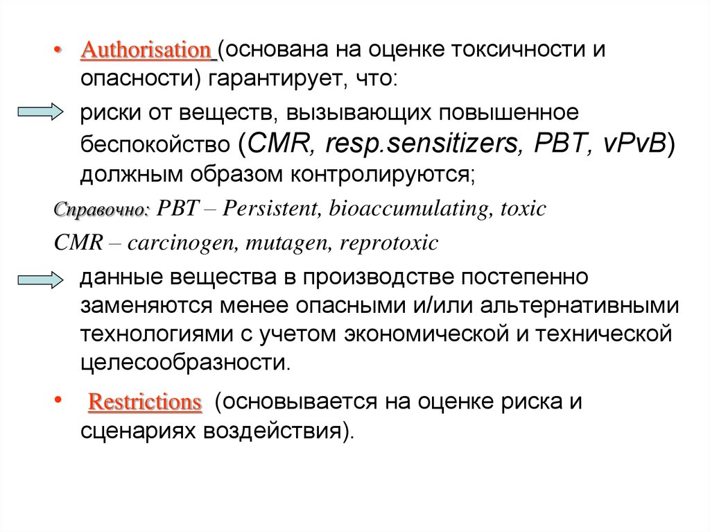 • Authorisation (основана на оценке токсичности иопасности) гарантирует, что: