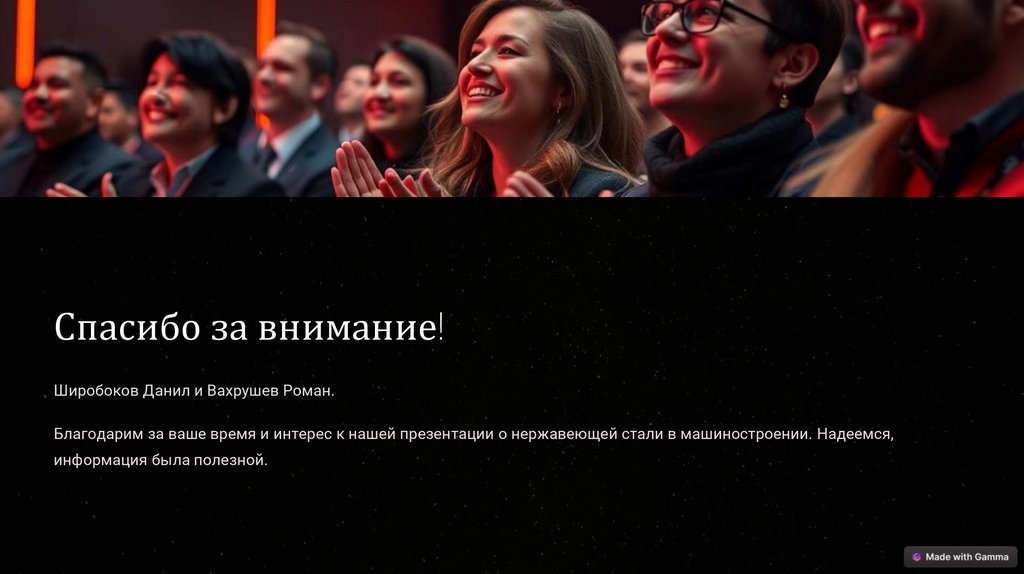Благодарим за ваше время и интерес к нашей презентации о нержавеющей стали в машиностроении. Надеемся,