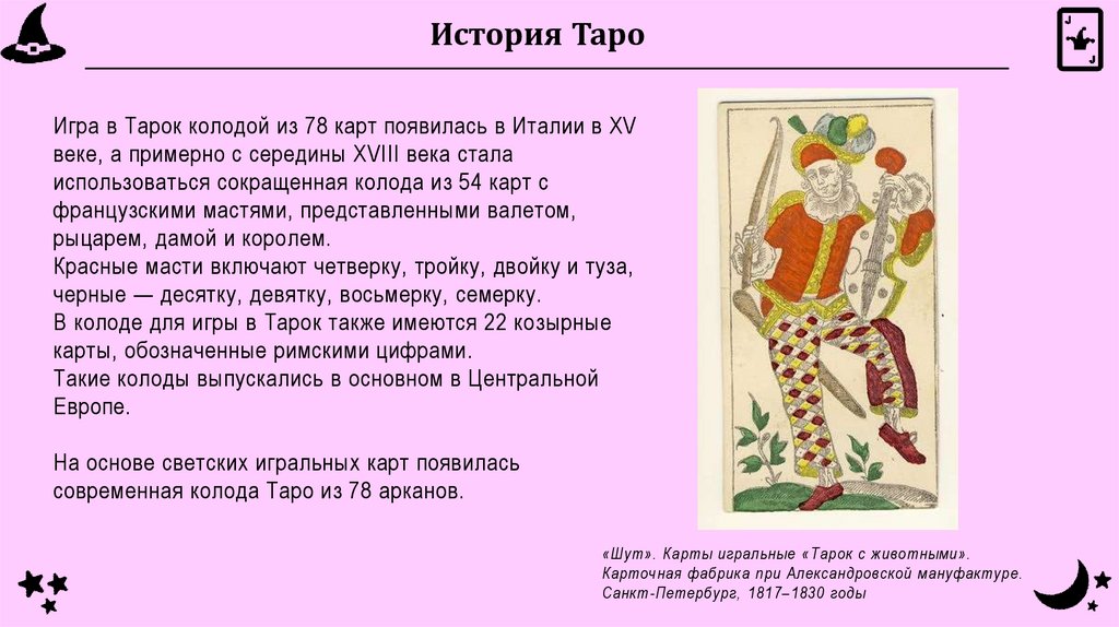 История ТароИгра в Тарок колодой из 78 карт появилась в Италии в XV
