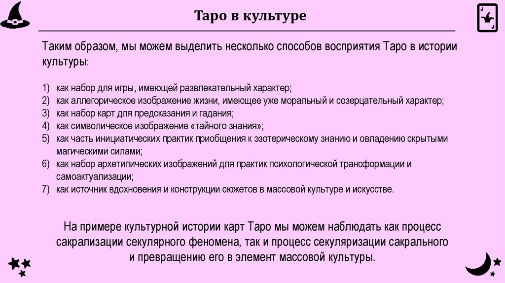 Таро в культуреТаким образом, мы можем выделить несколько способов восприятия Таро в истории