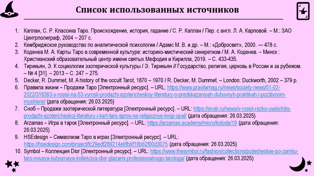 Список использованных источников1. Каплан, C. Р. Классика Таро. Происхождение, история, гадание / С. Р. Каплан / Пер. с англ. Л. А. Карповой. – М.: ЗАО