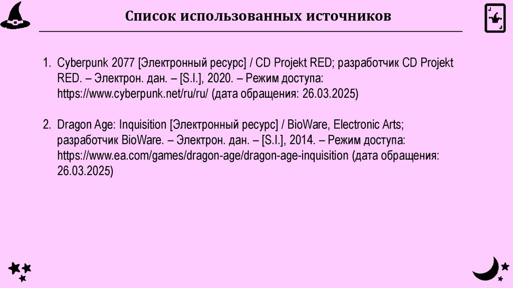 Список использованных источников1. Cyberpunk 2077 [Электронный ресурс] / CD Projekt RED; разработчик CD Projekt