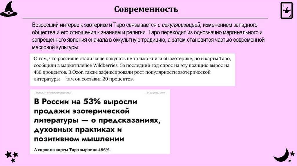 СовременностьВозросший интерес к эзотерике и Таро связывается с секуляризацией, изменением западного