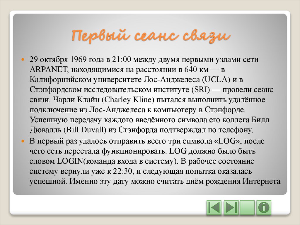 29 октября 1969 года в 21:00 между двумя первыми узлами сетиARPANET, находящимися на расстоянии в 640 км — в
