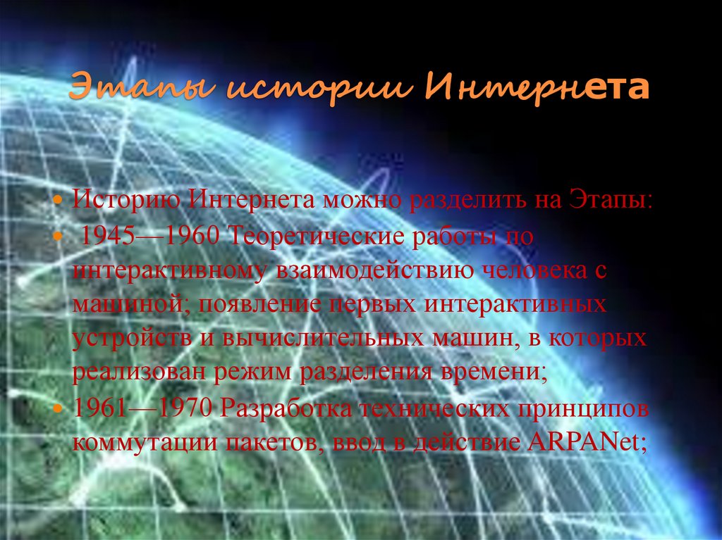Историю Интернета можно разделить на Этапы:1945—1960 Теоретические работы по
